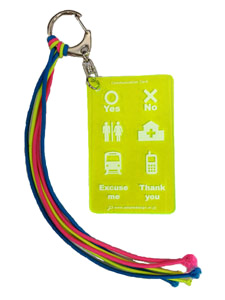 また、障害者の方から気軽に助けを求めることができるアイテムをプロデュースしています。日本人は基本的にはやさしいので困っている人がいたら手伝ってあげたいという気持ちはもってはいるけど、シャイだし障害者と接した経験もほとんどないので実際にそういう人を見かけてもなんて声をかけていいのかわからないという人が大勢いると思うんですよね。例えば、電車やバスに乗っているとき、「お腹に赤ちゃんがいます」というバッヂをつけている女性には席を譲りやすいけれど、妊婦かどうかわからない人にはなかなか声をかけづらいですよね。また駅などで困っている外国人に対しても同じです。