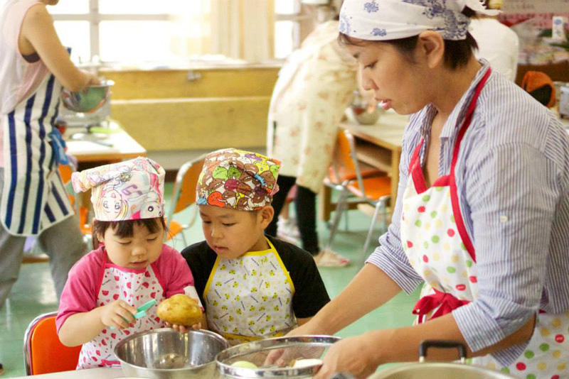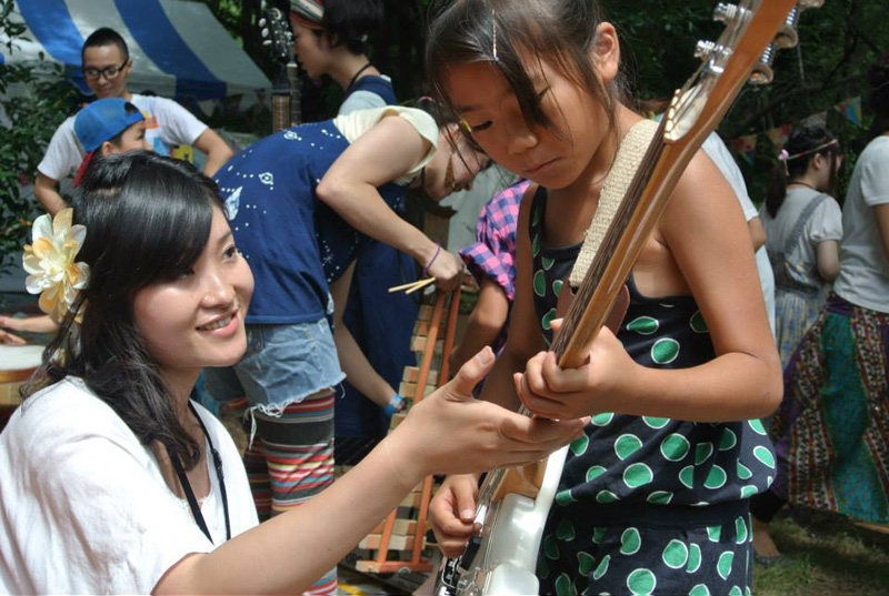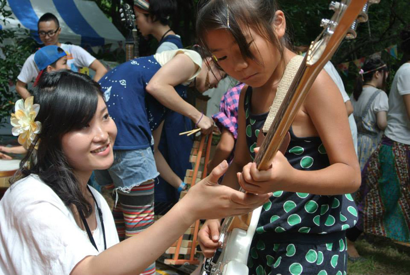基本は、「子どもは自分の好きな素材を使って自由に表現(制作遊び)できる」+「大人は子どもを知ることができる、育児相談ができる、パパママと交流ができる」といった感じで構成しています。他にも音楽や料理のテーマを持たせて、ライブハウスや小学校の調理室で実施することも。音楽がテーマの時は、「本物の楽器に触れる」を軸にアーティストや音大生とコラボするなど、夏には音楽フェスでもやらせてもらいました。料理がテーマのときは、家から余っている食材を持ち寄って何かをつくるんです。構成にこだわりを持っていて、子どもは向かいの部屋に用意したasobi基地スペースで遊び、大人は「子どもの好き嫌いについて」や「お手伝いについて」対話をした後、子どもたちと合流して一緒にレシピを考えて料理を作ります。大人も子どもも自分ができる作業をやり、作り上げる。そして、自分たち以外のチームのものも一緒に並べて、みんなで一緒に食べるんです。これが想像以上に楽しいんですよね。