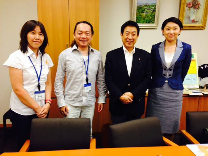 タイガーマスク基金では児童養護、虐待根絶のための政策提言など、政府への働きかけも積極的に行っている。写真は「児童の養護と未来を考える議員連盟」の会長を務めている塩崎恭久議員と元少子化相で当時は財務副大臣の小渕優子議員と面会した際に撮影(2013年9月25日)