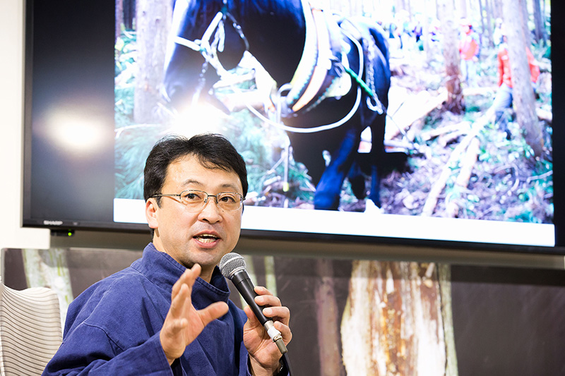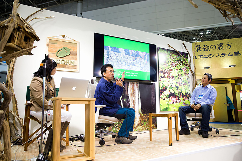 2013年12月に開催されたエコプロダクツ2013のオカムラブースで開催されたトークセッション「C.W.ニコル 森の学校」でアファンの森について語る石井さん。WAVE vol.8に登場した馬搬馬方で遠野馬搬振興会の岩間敬さんも出演