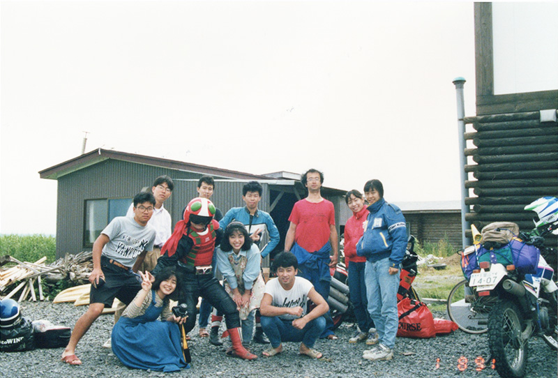 北海道の民宿でヘルパーをしていた頃の石井さん(前列でしゃがんでいる男性)と奥さん(その右隣のエプロンの女性)