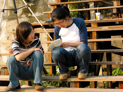 現地で打ち合わせ中の菊池さん(右)