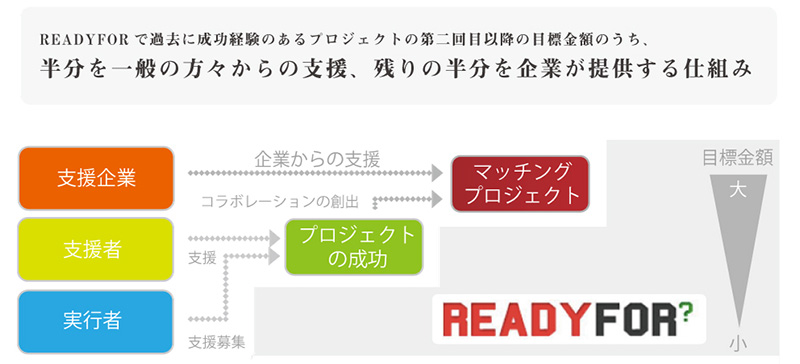 「マッチングギフトサービス」があります。READYFOR?で過去に成功したプロジェクトがその後も継続して支援を求めるとき、目標金額の半分を一般の人々からの支援、残りの半分を企業が提供する仕組みです。企業が共同実行者となるわけなので、より大きな目標金額を得ることができます。