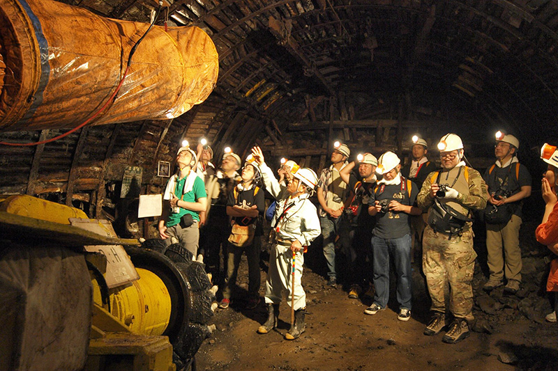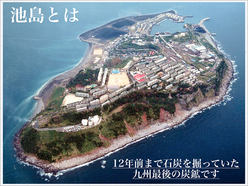 長崎県の西彼杵半島の西沖合約7キロに浮かぶ周囲4kmの小さな離島です。九州は昔から石炭掘削の盛んな地域で、高島、伊王島、端島(通称・軍艦島)といった炭鉱の島がいくつもありましたが、石油へのエネルギー転換や海外から輸入した方が安いということで、1970年代あたりから次々閉山となりました。その中で最後まで残っていたのが池島でしたが、それも2001年11月で閉山しました。それにともない、人口もどんどん減り続け、最盛期には8000人もいた人口が今では200人程度にまで減少しています。しかし、炭鉱設備や炭鉱アパートがまだきっちり残っている「島丸ごと産業遺産」とも言える日本でも数少ない場所です。また、トロッコに乗って本物の坑道も見学できます。