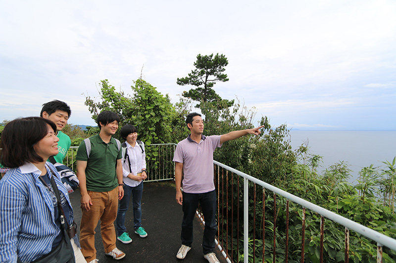 島を訪れた長崎大学の先生と学生を案内する小島さん