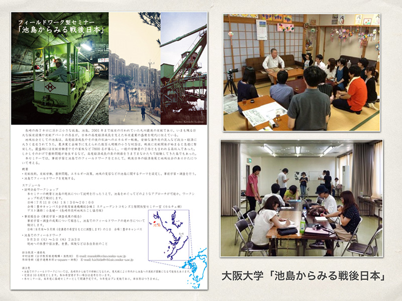 島には社会科見学時代に知り合ったおもしろい人たちが毎週のように来てくれていたのですが、その中にはクリエイターだけでなく大学の研究者もいました。2012年に大阪大学の先生が遊びに来てくれたとき島内を案内したところ、僕みたいに池島をすごくおもしろいと感じてくれて、もっと深く島のことが知りたいから「池島からみる戦後日本」というテーマで研究してみたいと。そこで島に昔から暮らしている人々を紹介して島の歴史を先生や学生に話してもらいました。その後、逆に学生が池島を歩いたり話を聞いたりして感じたことを、島の人たちの前で発表するということもしました。