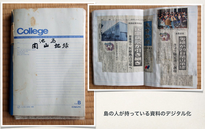 このような大学との活動ともリンクするのですが、僕自身、島のお年寄りたちの話を聞いてICレコーダーやビデオカメラで録音・録画して保存してきました。また、島の人が持っている昔の池島に関する新聞記事などの資料や、行政センターや学校などにあった写真をスキャナで読み取ってデジタル化し保存しました。その資料を再度地域の方々に見せるとやっぱり懐かしがったり喜んだりするんですよね。こうすることでコミュニティを活気づけつつ新たな情報を得たりしました。また、それらの資料を見せるだけではなく、地域の方々に配りました。こうしておけば、僕の協力隊としての任期が終わり島から出た後も、池島の資料が誰かの手には残りますからね。