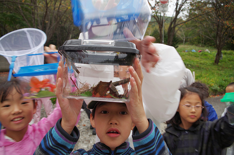 2013年に苗場で実施した「理科の修学旅行」にて、観察用に採取した昆虫を掲げる子どもたち
