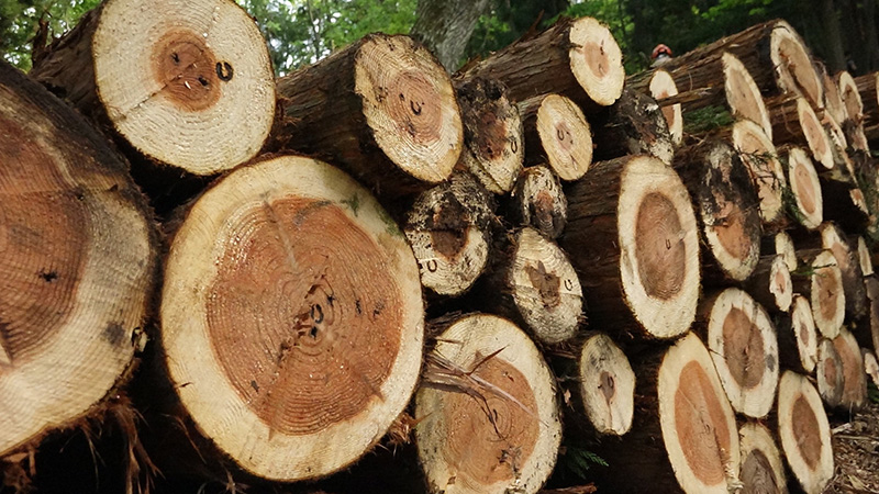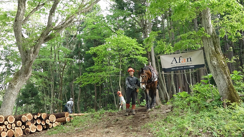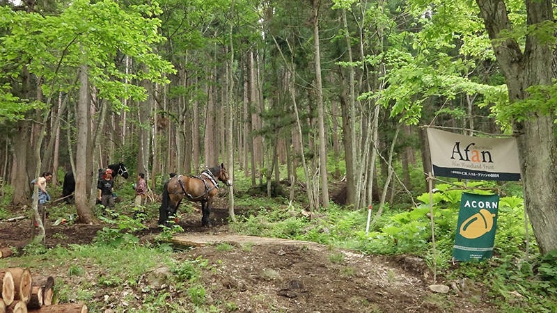 まずは暗く荒れ放題の人工林に光を呼び込むため、残すべき木を選び、健全な成長が見込めない木の間伐を、森林管理の一人者である京都大学名誉教授の竹内典之先生の指導のもと実施しました。放置されていた人工林には作業道もなく、伐り出した間伐材を運び出す手段としてホースロギング(馬搬)を行うことになりました。