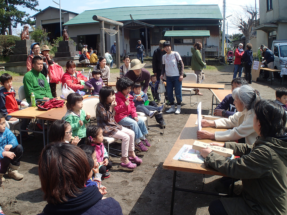 絵は実行委員の1人の知り合いで、紙芝居もたくさん作ってるプロの木版画家に頼みました。文章は私が担当して、木版画家と何回も打ち合わせしてお話を作ったの。紙芝居の最後は、今はこうやってお祭りも朝市もやっていて、神社が活性化していますよというシメにしています。その紙芝居は、私たちが上演する用と町への寄贈用と町民が誰でも借りられるように図書館への寄贈用の3つ作りました。