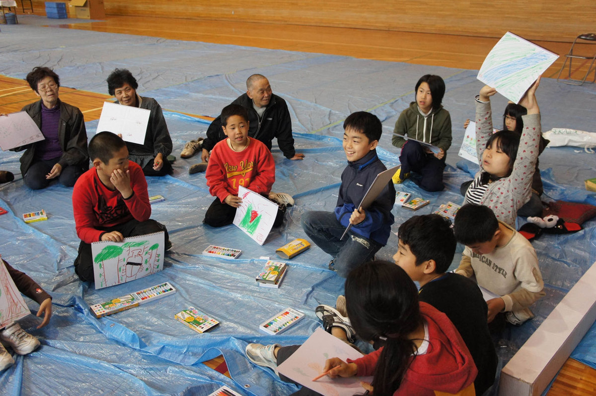 最初は東京から被災地の避難所に物資を運ぶだけだったのですが、それを毎週続けている内にあることに気付きました。当時はちょうど春休みで、大人は泥かきに出かけて不在で、避難所にいるのは子どもたちばかり。彼らはやることがなくて退屈そうにしてたり、つまらなそうにゲームをやっているだけでした。その光景を見て、もしかしたらここで絵を描くワークショップみたいなものをやったら子どもたちも気が紛れるかもと思って、物資を届けていた避難所で絵のワークショップをやり始めたんです。そのときケニアのNGOの代表もワークショップ開催の許可を求めにいろんな避難所を回ってくれました。