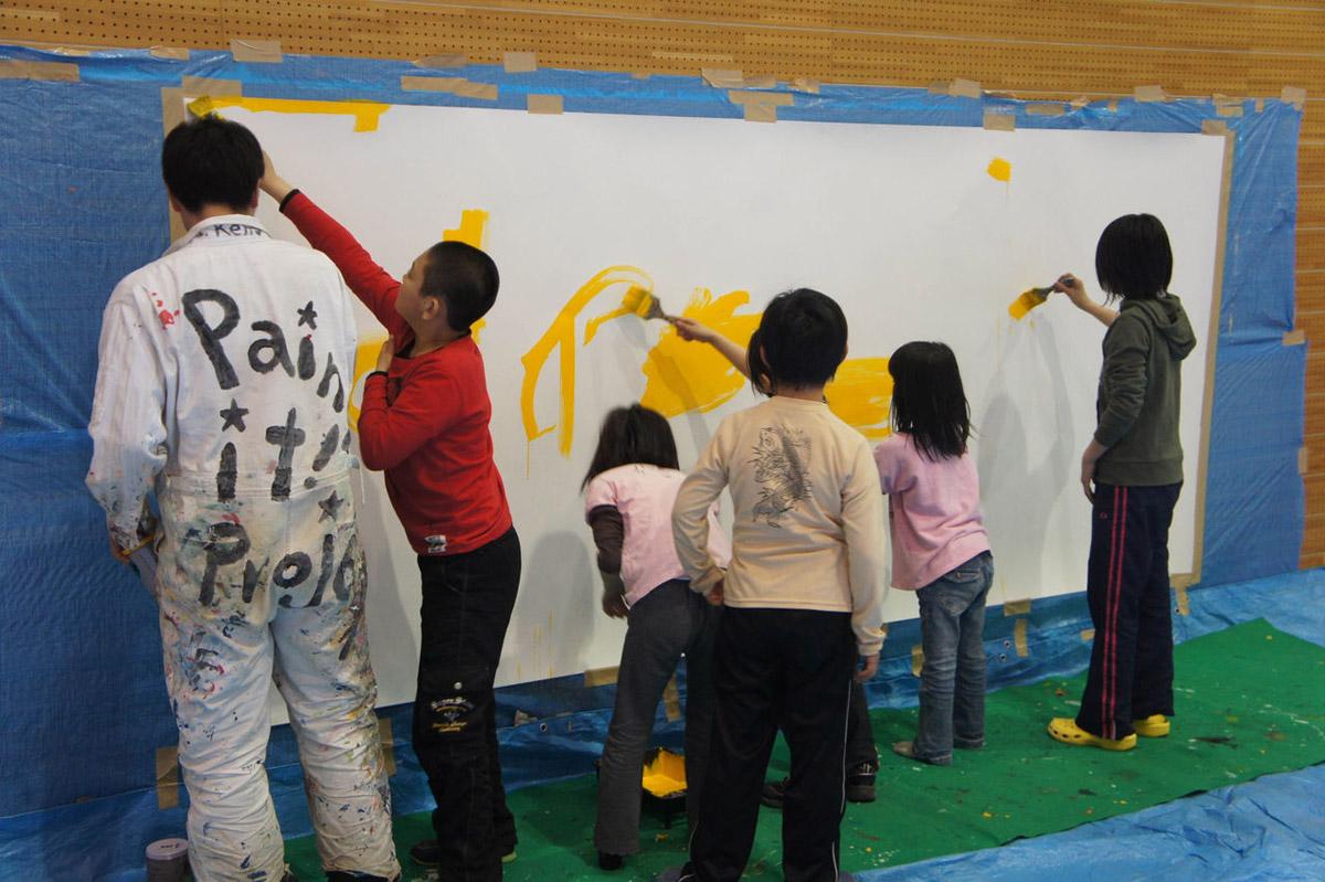 その後、「東北壁画プロジェクト」として、いろんな場所で現地の子どもたちと絵を描いたり、ワークショップをやったりしました。毎週やるうちに少しずつ子どもたちが明るく元気になって、地元の大人にも感謝されたのでこれもやってよかったと思いましたね。