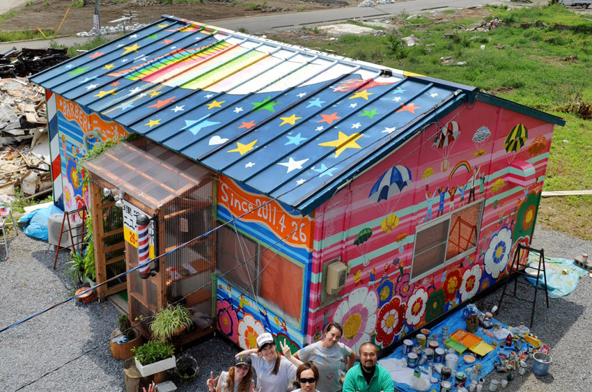 はい。特に大船渡で津波に流された後に仮設で建てた理容室全体をペイントしたときは、屋根の上まで全面ピンクみたいな、めちゃめちゃ派手なものを描いたんですね。ここまでやると店主や現地の人たちに不謹慎だと怒られるんじゃないかと思ったんですが、中途半端に描いてもしょうがないので思い切って描きました。そしたら、あまりに目立つので人々が集まってきたんです。この理容室の店主はみんなに元気を与えたいから津波で流された場所に再び仮設理容室を建てて営業しているわけですが、そこに僕の絵がプラスされることによって人々の交流が生まれた。これもやってみて気付いたことだし、絵には何かしらそういう力はあると信じているんです。