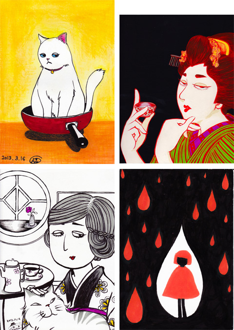 ちえさんの作画風景とイラスト作品。お客さんの要望に応えようとした結果、劇画からゆるい漫画まで、描けるタッチのバリエーションが増えた。これまで数回個展を開催している。さらに切り絵も得意としており、その腕はプロ級