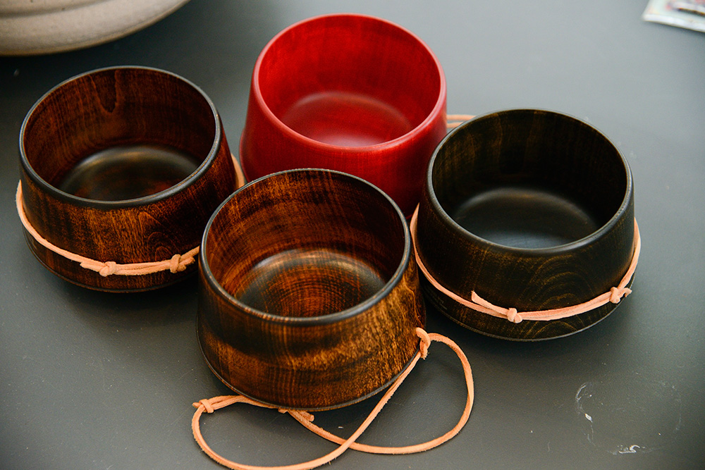 私はキャンプやフェスが好きでプライベートでも家族で参加していたのですが、アウトドア用品として売られているアルミ製やプラスチック製のカップや器が味気ないと常々思っていたんです。自然の中に行ったら自然の恵みを道具として用いたい、という単純な思いです。かといって陶磁器だと重いし壊れる心配があり、アウトドア利用には向きません。そこで漆器で作ったらどうだろうと。木は軽くて丈夫だし、熱を通さないから中に熱いものを入れても取っ手がいらない。だからまずは木製のマグカップを作ることにしたんです。つまり自分が使いたいものがないから自分で作ろうというところから出発してるんですよ。