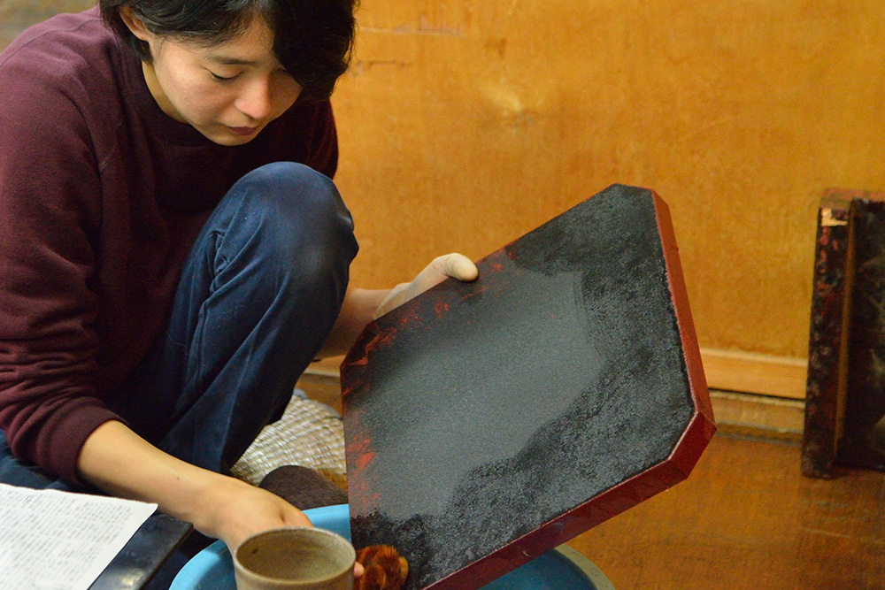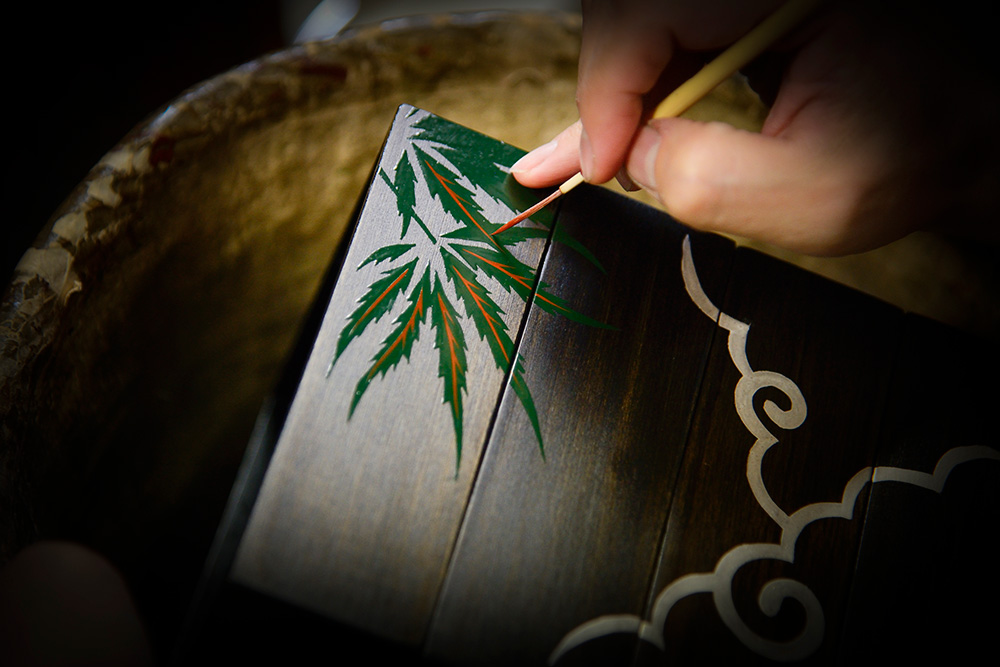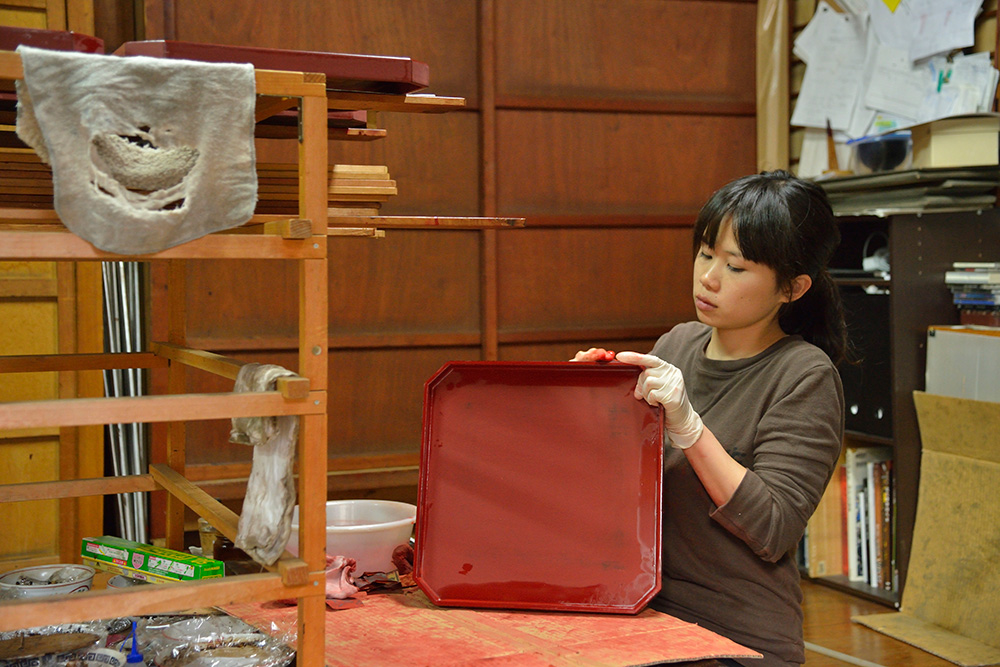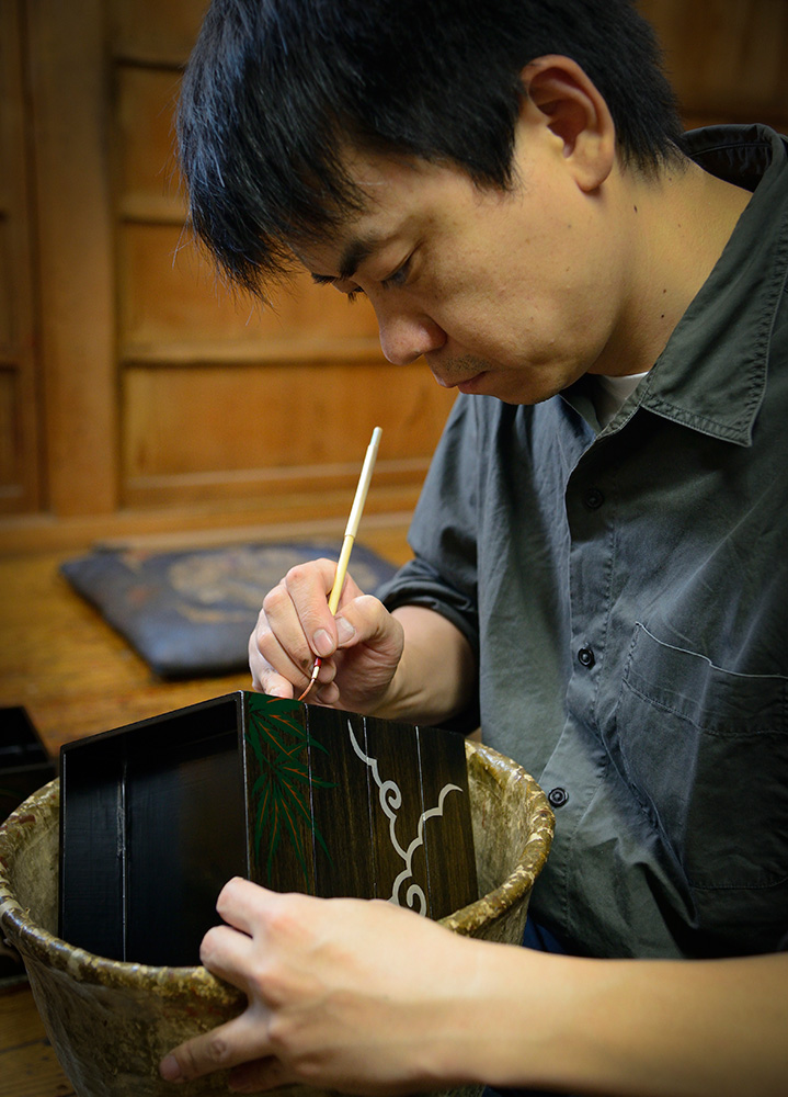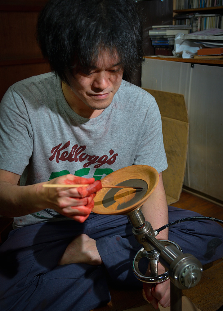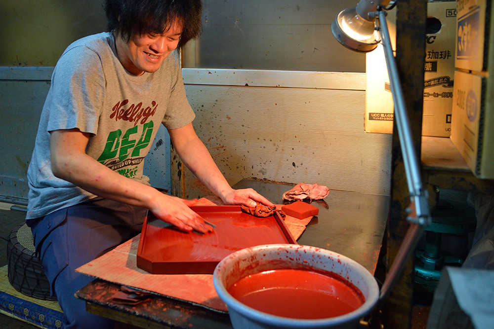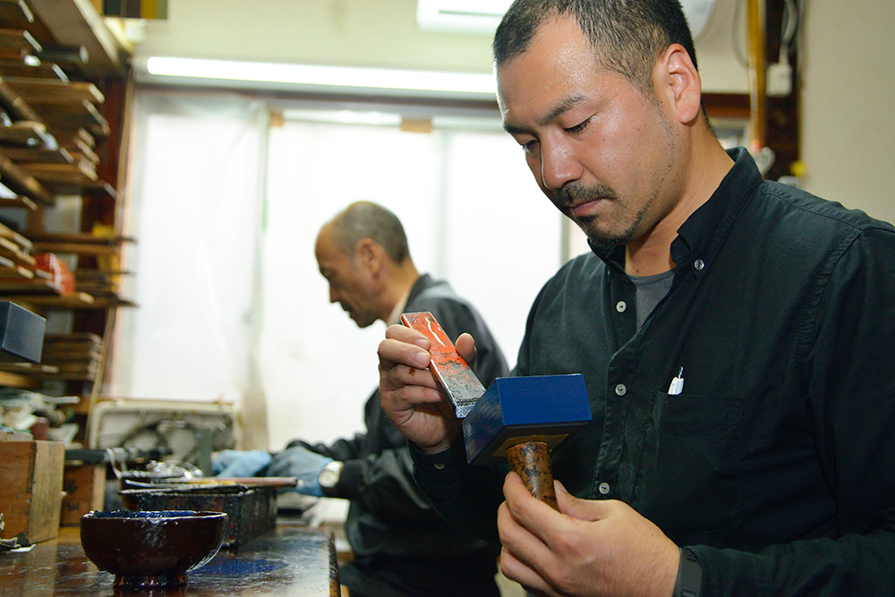 会津漆器の世界は完全分業制なんです。まずどういう製品を作るかという企画、デザインが決まると、木地づくり→漆塗り→蒔絵描きという工程をたどります。その工程ごとに木地師(丸物・板物)、塗師(丸物・板物)、蒔絵師(手描き・スクリーン印刷)という職人がいて、それぞれに依頼して作ってもらっています。