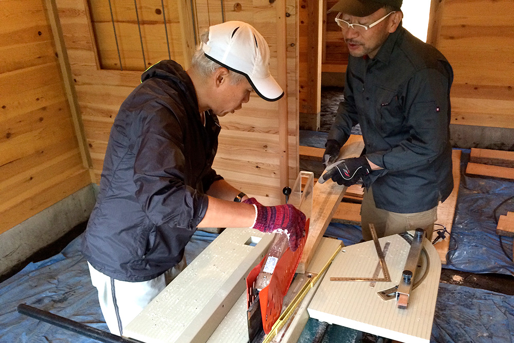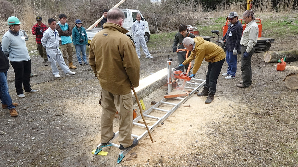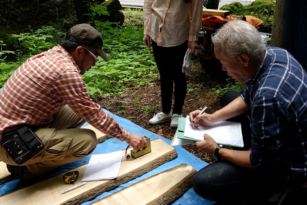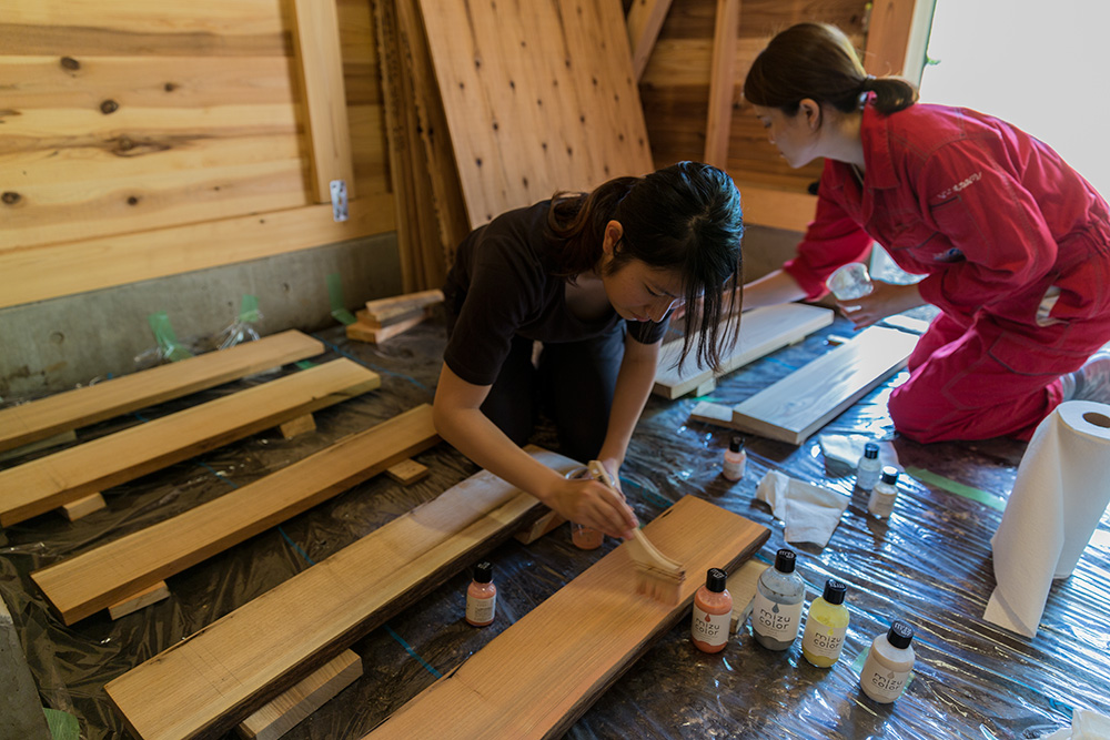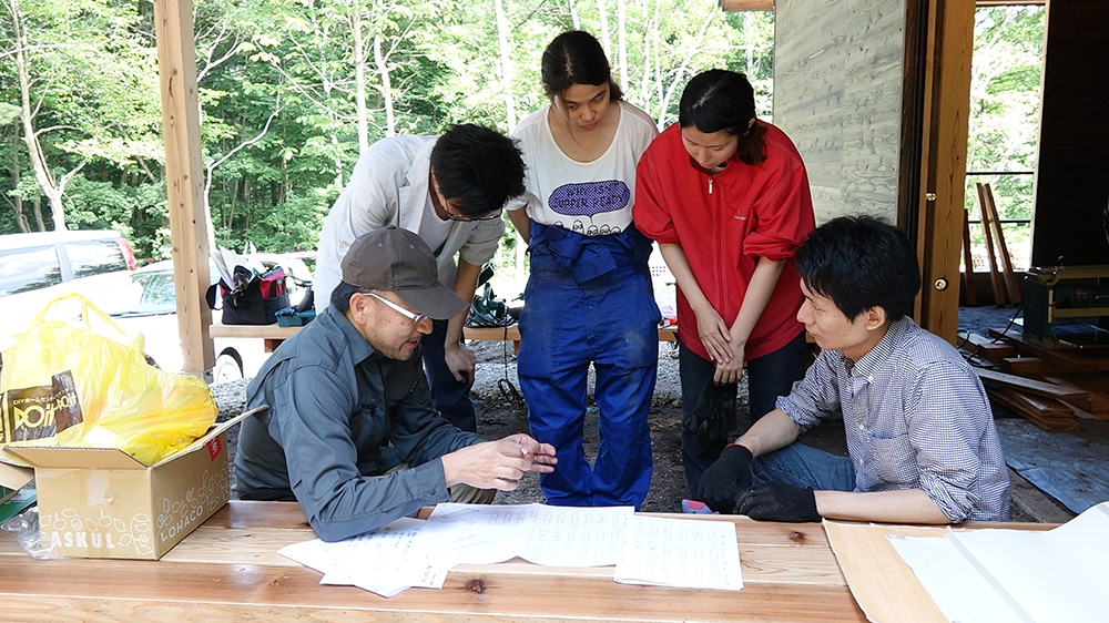 佐藤 まずはアファンの森から馬搬で伐り出した丸太を板材に加工して、自然乾燥させる製材から行いました。その後、家具の板にするために正寸でカットして、塗装をして、最後は施工までして完成させたんです。ポイントは学生さんたちが自分たちで実際に木を触って家具を作り上げたという点。オカムラの社内的にも初めての試みでした。学生さんたちは森での木の生え方とか伐り出し方、加工の仕方など、普段なかなか目にしたり経験したりすることはないじゃないですか。今回は森から木を伐り出すところから参加してもらい、それらを現場で伝えることができたので、非常に有意義な木育の機会になったと思っています。