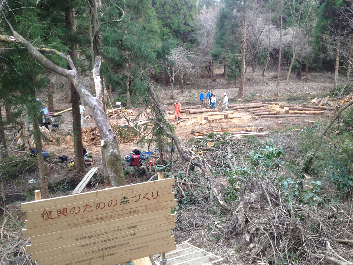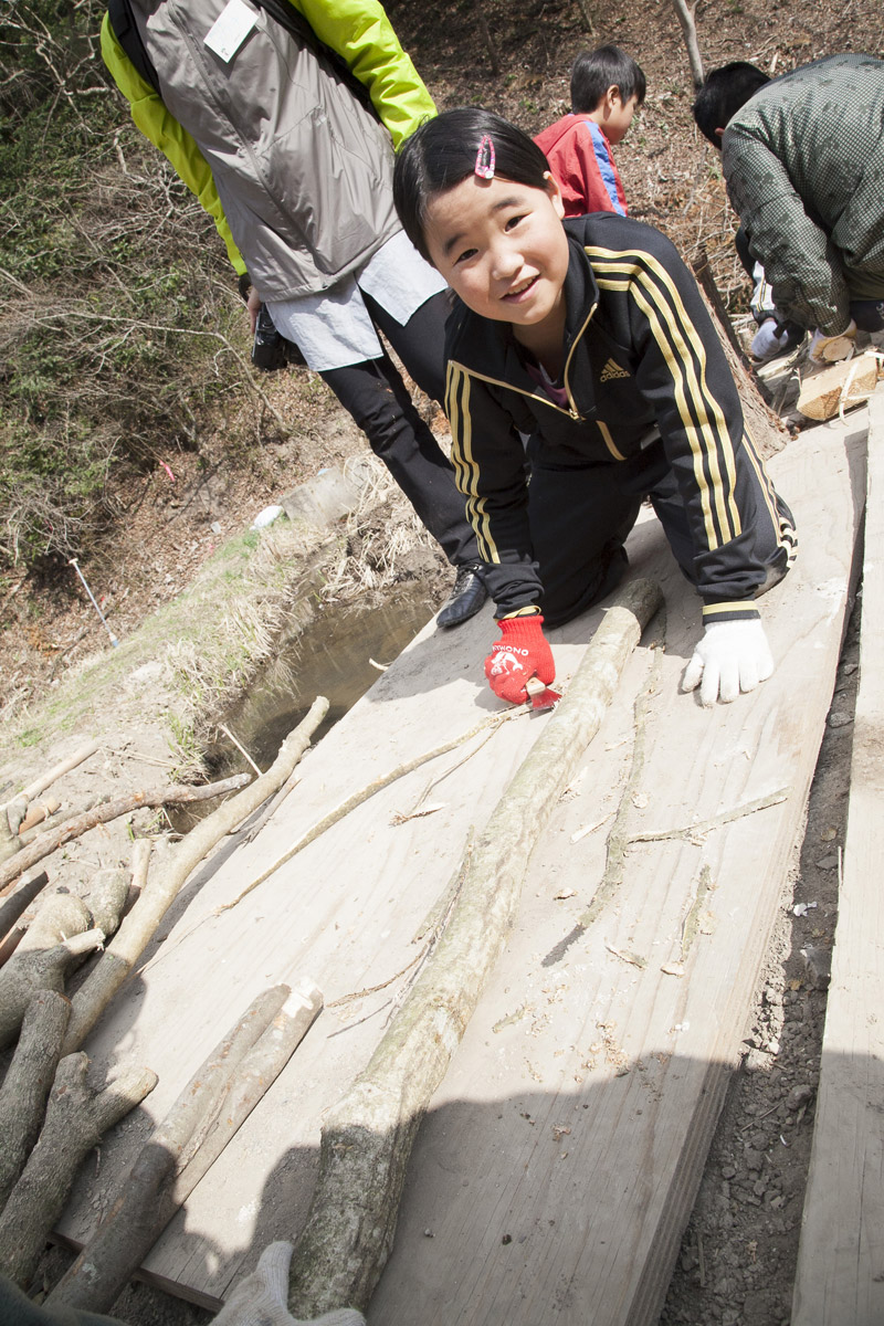 「森の学校」は、学校の中だけではなく森も学ぶ場所と位置づけていた。そのため、校舎建設を待つことなく、建設予定地に隣接する森を「復興の森」と名付け、荒れ果てた森を整備しながら森の中でさまざまななことを学ぶプログラムをスタート。その目的をニコル氏は「子どもたちが自然の中で遊び、学び、また森づくりを通じて様々な経験を積むことで元気な心と絆を育んでいくため」と語る。この復興の森づくりは震災復興プロジェクトの中でも活動の柱の1つとなっていくが、素早い対応が可能になったのは、森のある山を東松島市が民間所有者から丸ごと買い上げていたからこそであった。「元々、この山は長年放置されていた荒れ放題の山だったので、そのままにするよりも活用したいと考えていました。また、市としても山に隣接する学校を作るのは初めてだったので、自然学習など森でも学べて、子どもたちが元気になるような場所にしたいという思いもあったのです」(元・東松島市復興政策部部長・高橋氏)