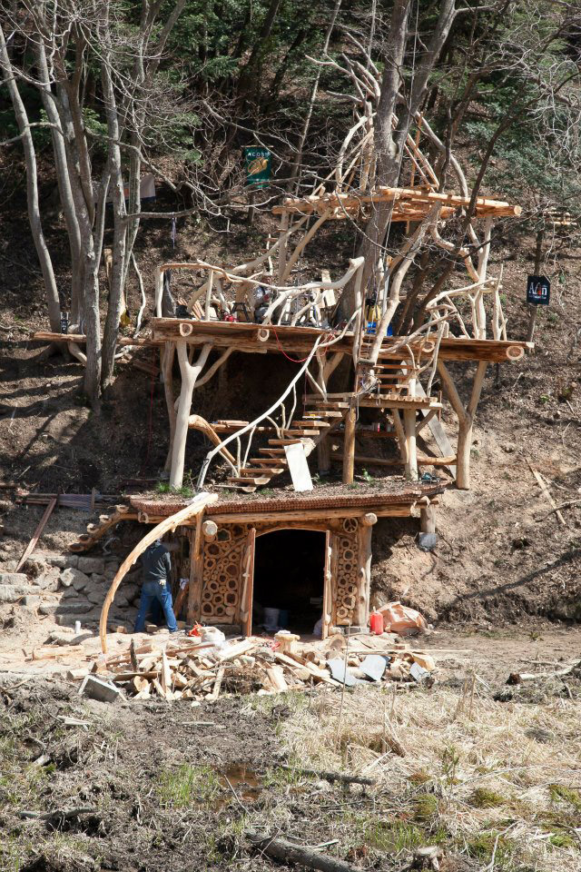 4月には地域住民と一緒につくるワークショップを開催。参加した多くの大人も子どもも材料となる木の皮を剥いだり、壁を塗ったりして懸命に作業した。制作のための資源は元々この地にあった樹木や石などが使われた。