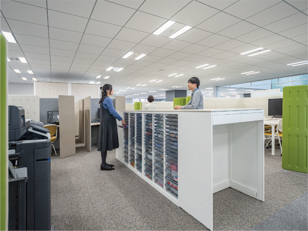 新しい働き方のコンセプトの一つである「資源の集約・共用化」を推し進め、これまでは課ごとに管理していた備品類を一括調達して中央管理。複合機やシュレッダー、文房具などを共用化することで、スペースの削減とともにコストの低減も図っています。