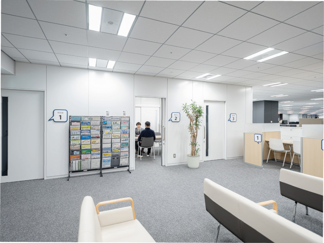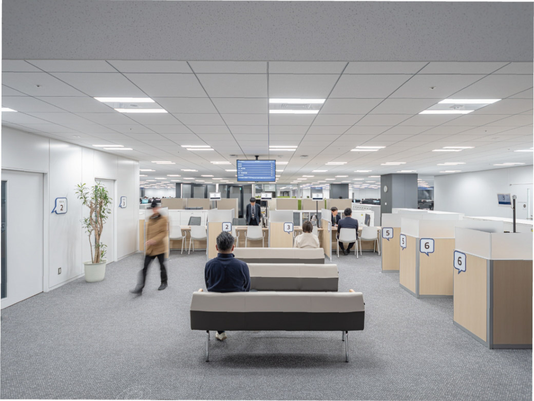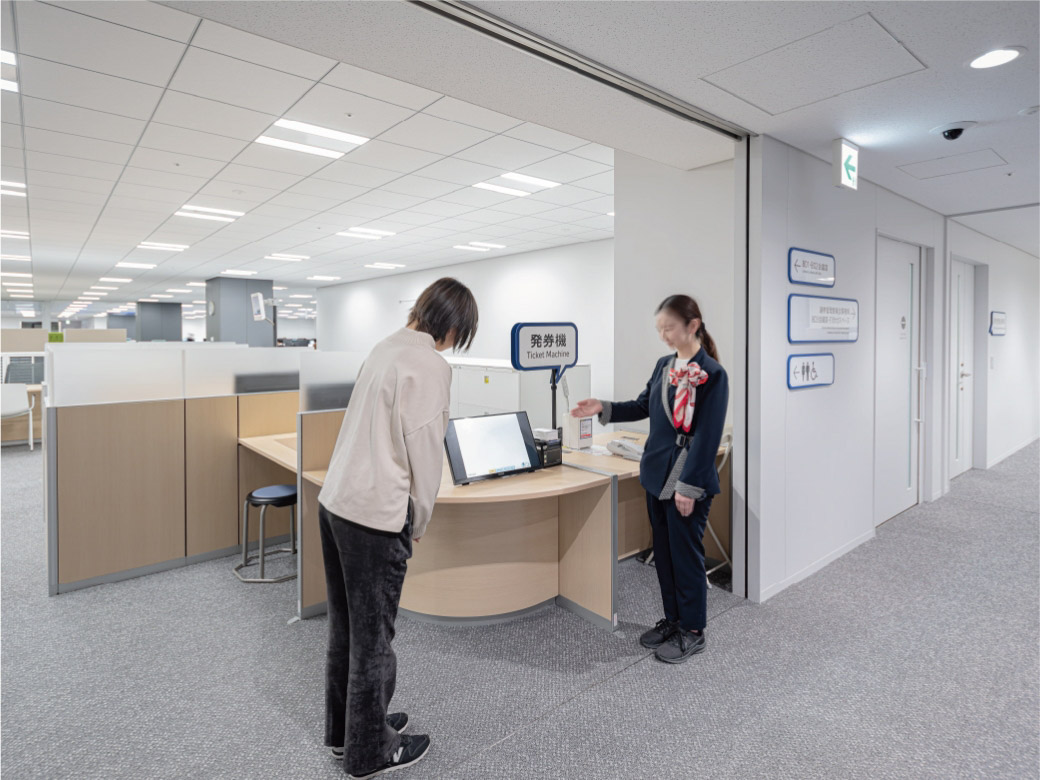 上層階では、これまで各課が専用で持っていた窓口カウンターや待合スペース、相談室、来客対応スペースなどを集約・共用化した「共用窓口」を整備。スペースの効率化だけでなく、来庁者は窓口を移動することなく快適に手続きを行うことができます。