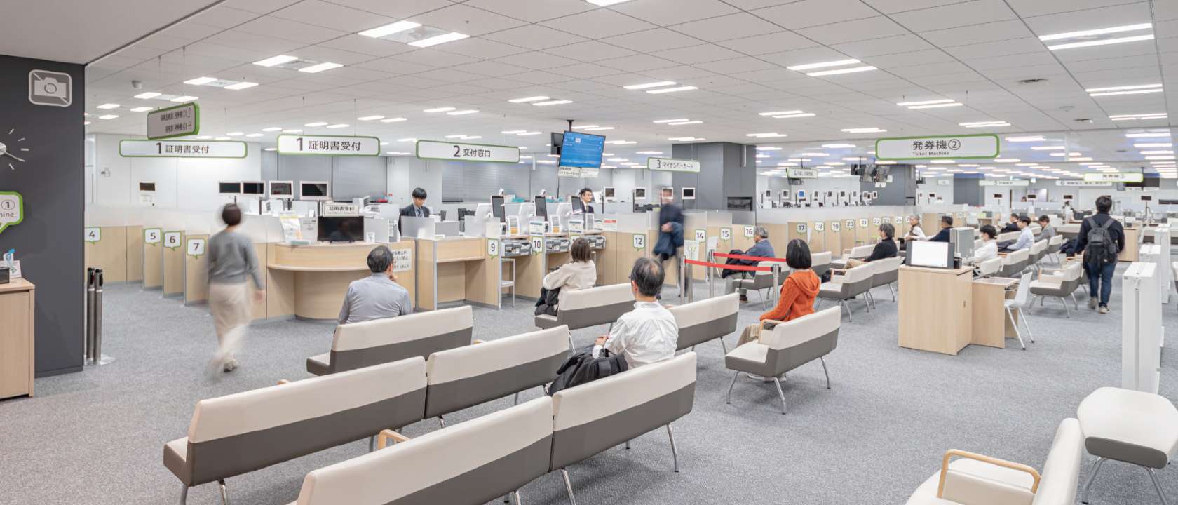 「なかのスマート窓口」と呼ばれる新しい中野区の区民窓口では、「4つのない+1」という取り組みがなされています。「動かない」「迷わない」「書かない」「待たない」そして+1の「行かない」。これによって区民の利便性が今までよりも大幅にアップし、快適かつスムーズな手続きや相談を行うことができます。ユニバーサルデザインにも配慮され、誰にでも利用しやすい庁舎が実現しています。